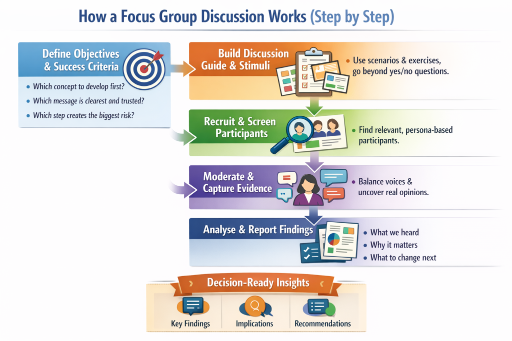 Unlike generic market-research pages, we’ll be specific about how the work is run: group size, session length, discussion guide structure, stimulus testing, analysis approach, and the evidence pack stakeholders typically need to trust and reuse the findings.